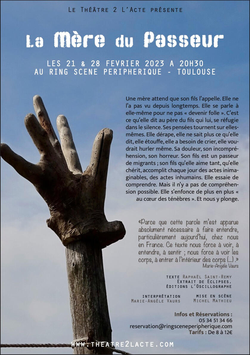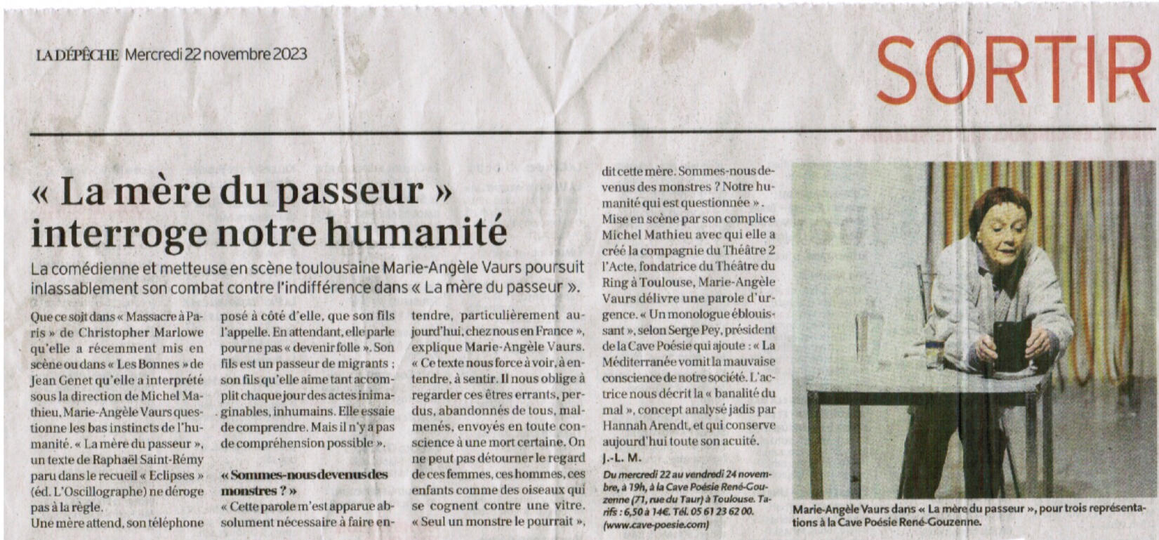 "Marie Angèle Vaurs dans « La mère du passeur », nous montre l’envers éthique et émotionnel d’une société de la honte vécue. L’être humain est une marchandise que l’on peut noyer. Ici on viole les morts et les enfants des morts. La Méditerranée vomit la mauvaise conscience de notre société. Dans un monologue éblouissant, l’actrice nous décrit la « banalité du mal » concept analysé jadis par Hannah Arendt, et qui conserve aujourd’hui toute son acuité. Le dialogue téléphoné que l’actrice entretient avec son fils marchand de la mort immigrée est édifiant et nous renvoie à notre propre responsabilité. Le « Je t’aime » murmuré par une mère à son bourreau est aussi le « Je t’aime » d’une société. Écrit par Raphaël Saint-Remy :